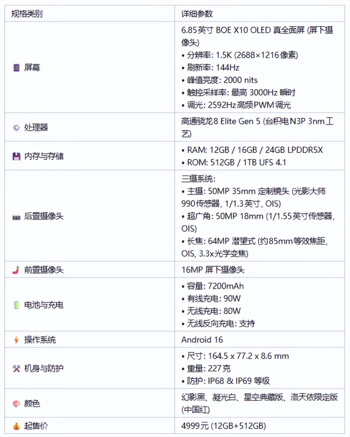7200mAh超大电池支持90W有线与80W无线快充,AI功耗管理专为影像创作优化,满足全天高强度拍摄需求。同步推出的“洛天依中国红限定版”以深度定制设计融合科技与文化,彰显品牌日益成熟的设计自信。