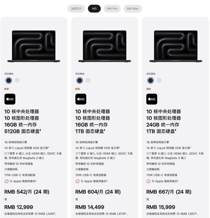 智东西10月16日报道股票配资资金,昨日晚间,基于苹果全新M5芯片的14英寸MacBook Pro终于来了,一同发布的还有搭载M5芯片的平板产品iPad Pro和空间计算设备苹果Vision Pro。三款产品均10月17日上午9点接受预购,10月22日发售。
