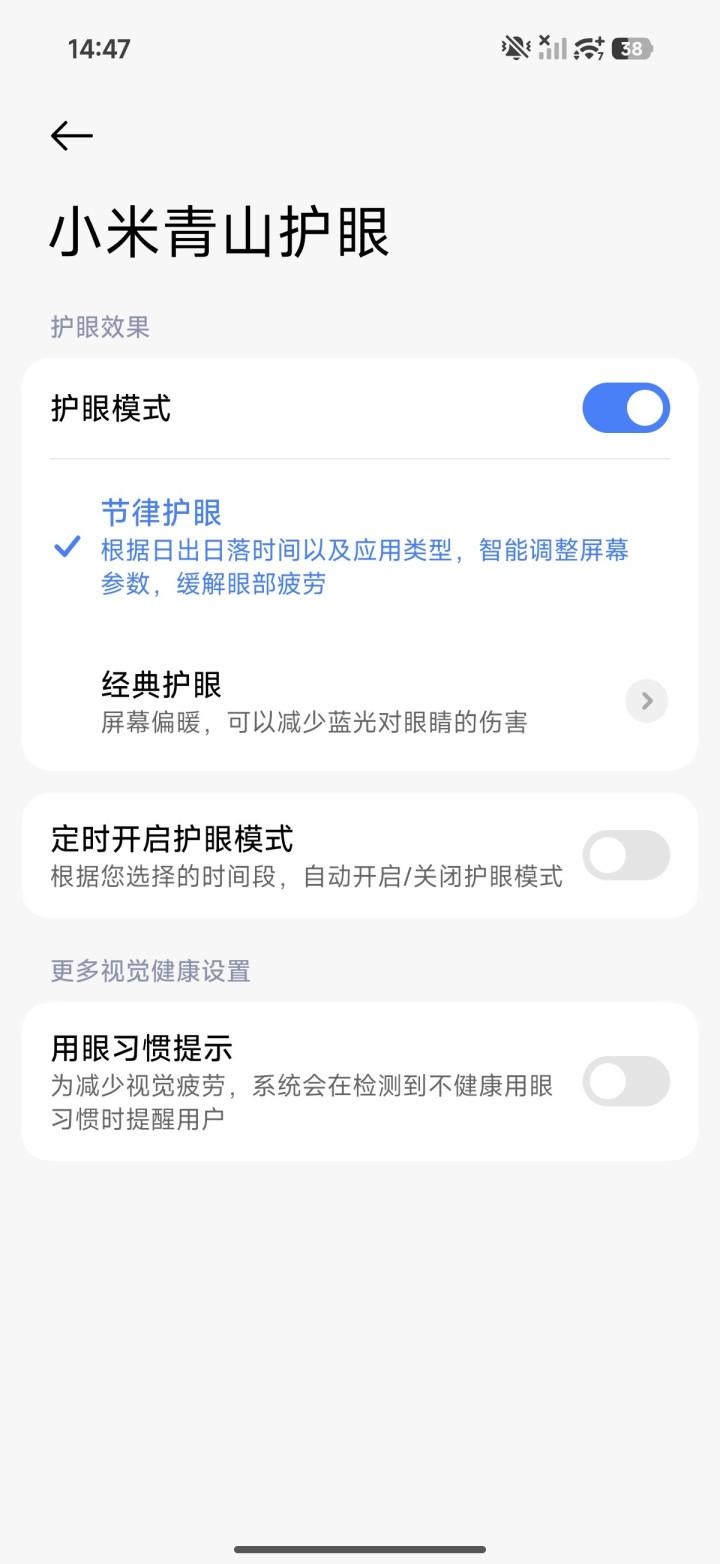 除了观感出色,K90ProMax在护眼方面也做了很多努力。它延续了全亮度DC调光,能有效减少频闪对眼睛的刺激。系统内置的“青山护眼”模式,可以根据时间自动调节蓝光强度,符合人体节律。一个很实用的细节是,它支持将屏幕亮度降至1尼特的极暗水平,在深夜或黑暗环境中使用,屏幕光线依然柔和,不会刺眼,极大地提升了暗光下的使用舒适度。